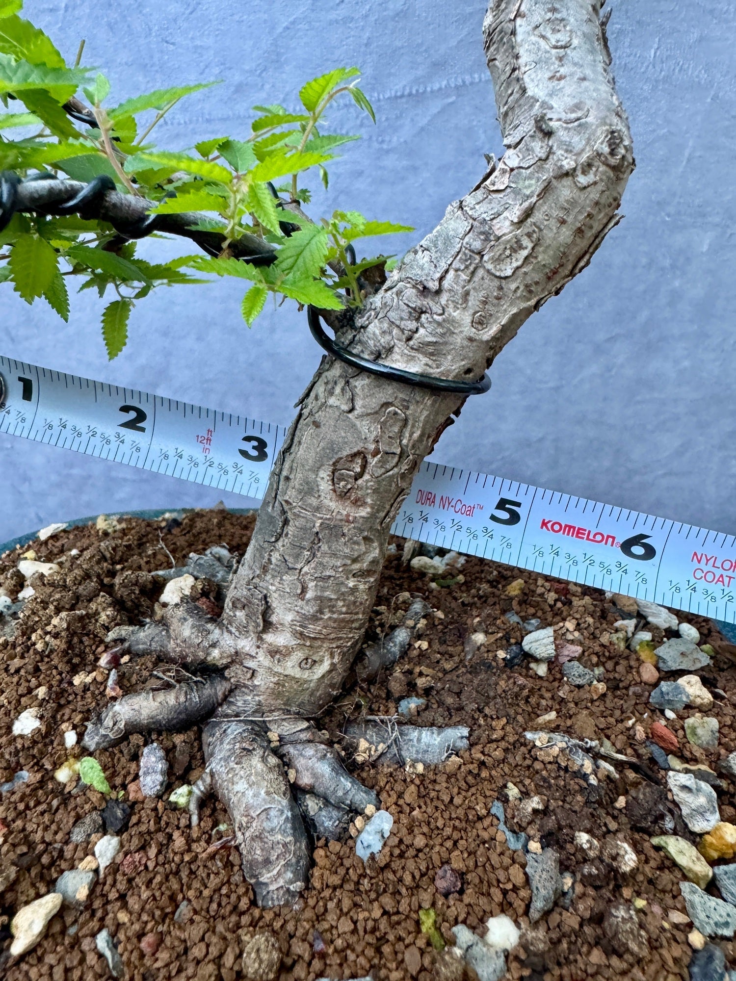 A cool little elm with good trunk movement and solid, radial nebari. This tree has been lightly worked the last couple years to get branches in place, but it may want to be cut back some to produce additional branching.It still has lots of design options open and it's ready for your next moves! In a glazed rounded rectangle - I believe Japanese, but may be Chinese.