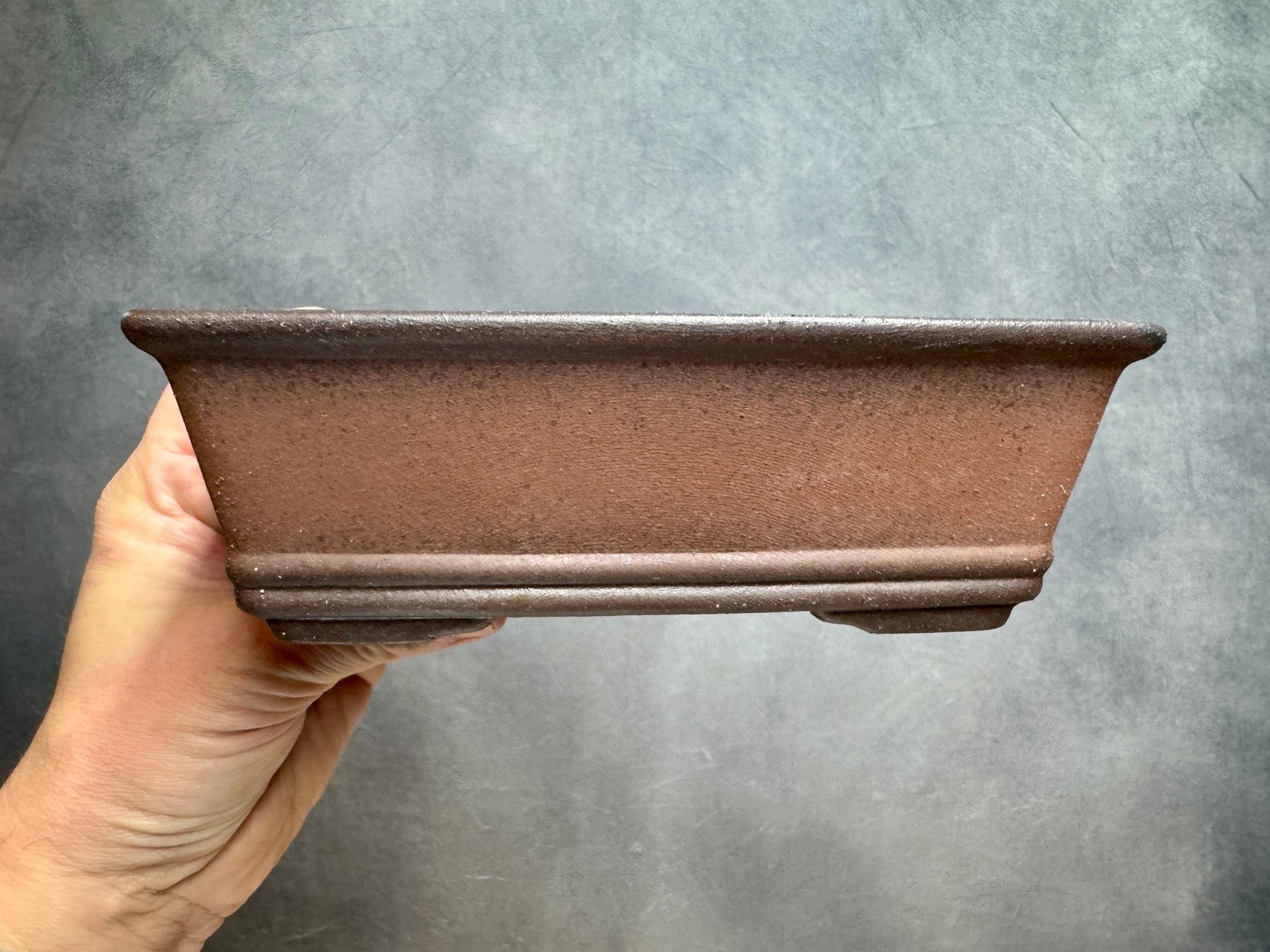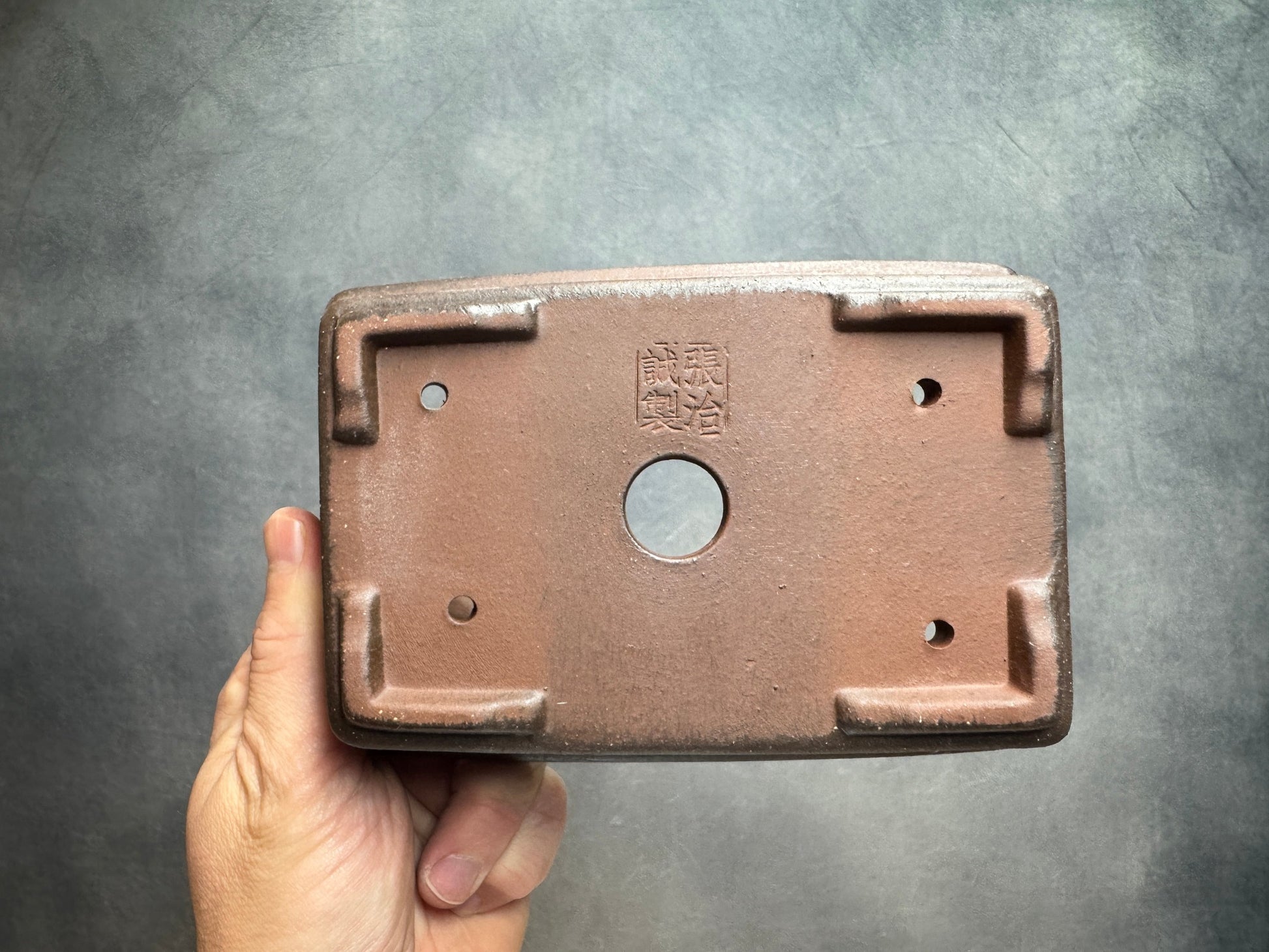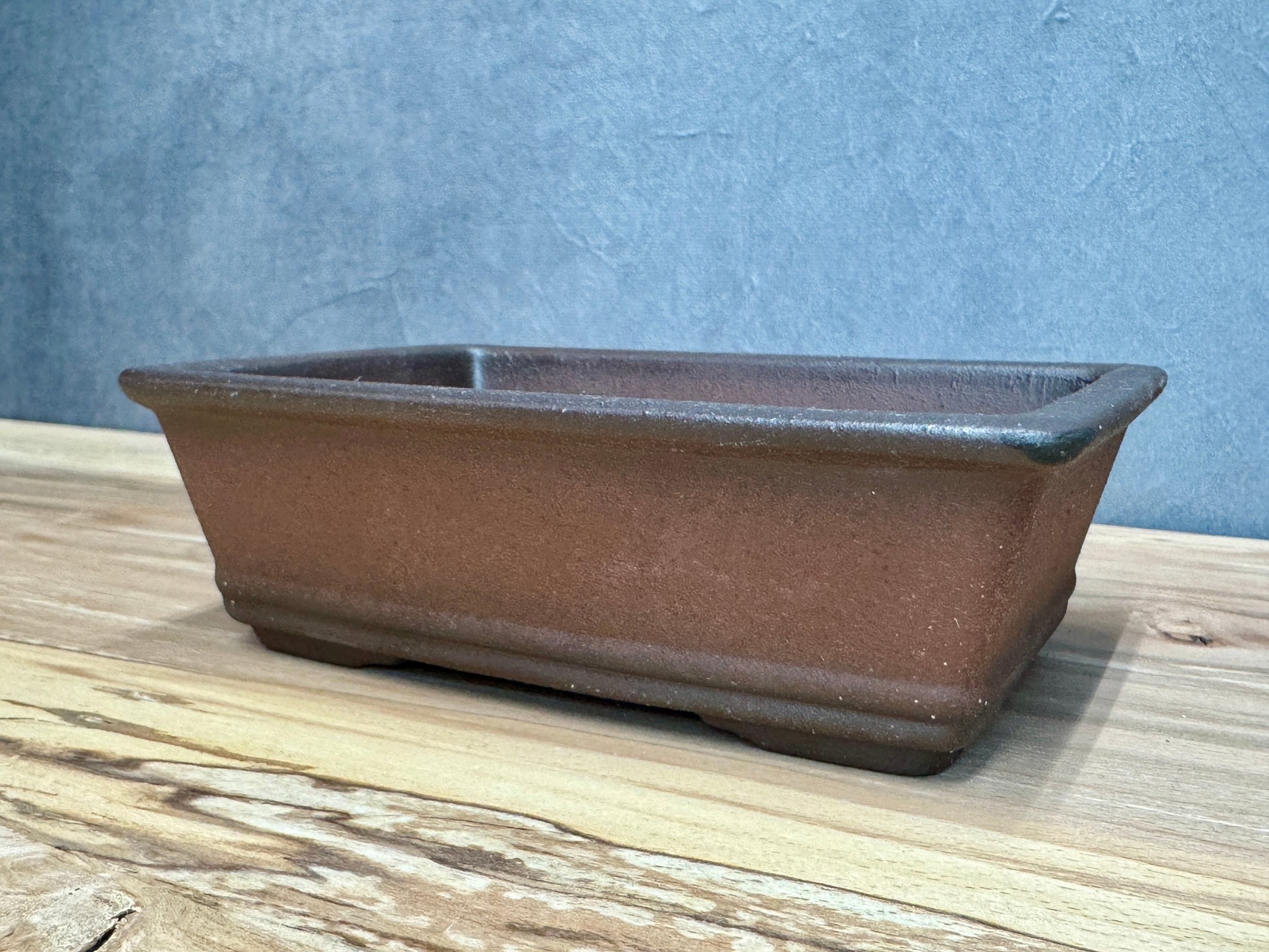 Classic and adaptable Yixing unglazed rectangle sporting a nice horizontal gradient. Chop mark/stamp on bottom. A more entry-level pot made with natural red clay.