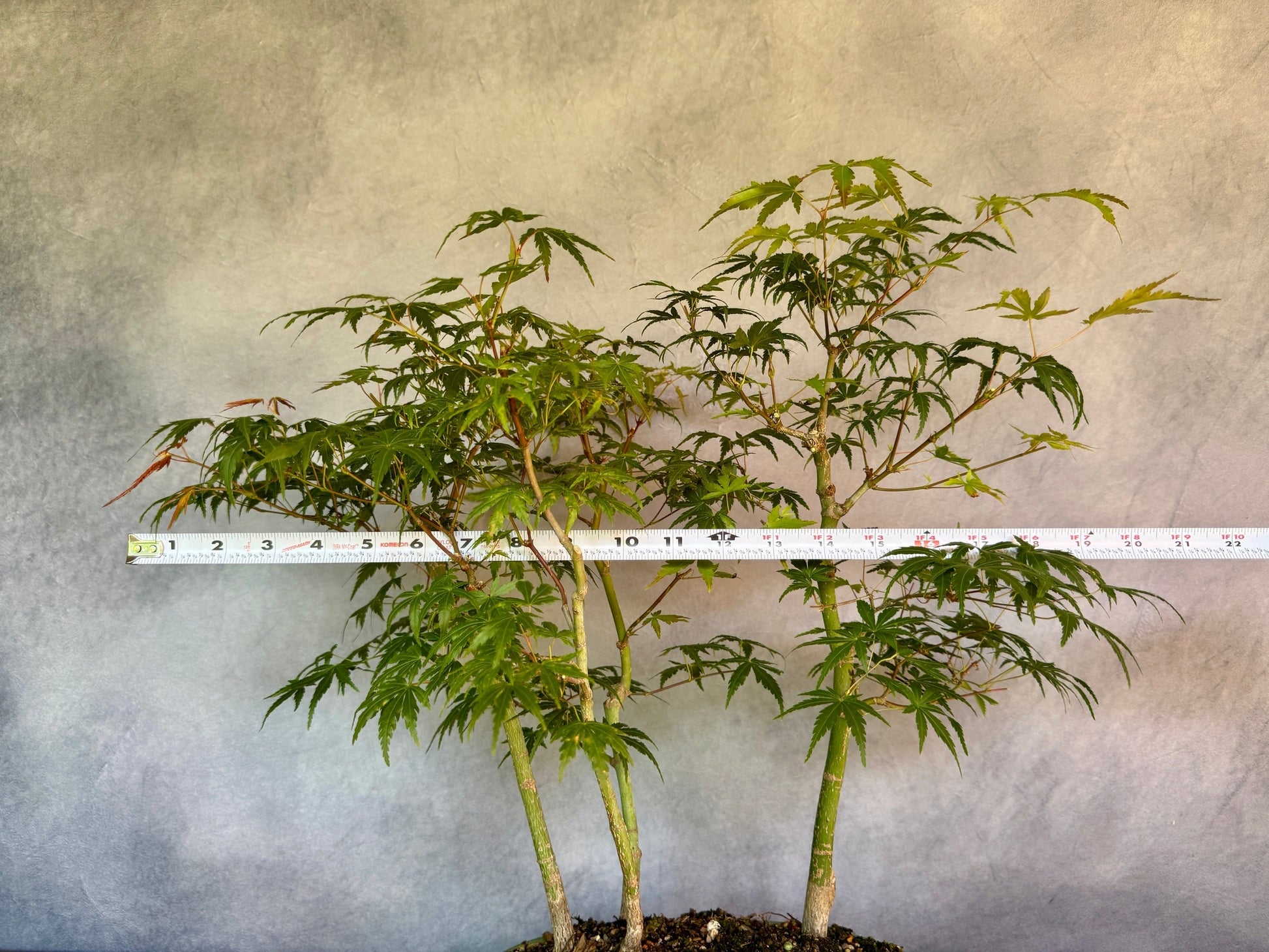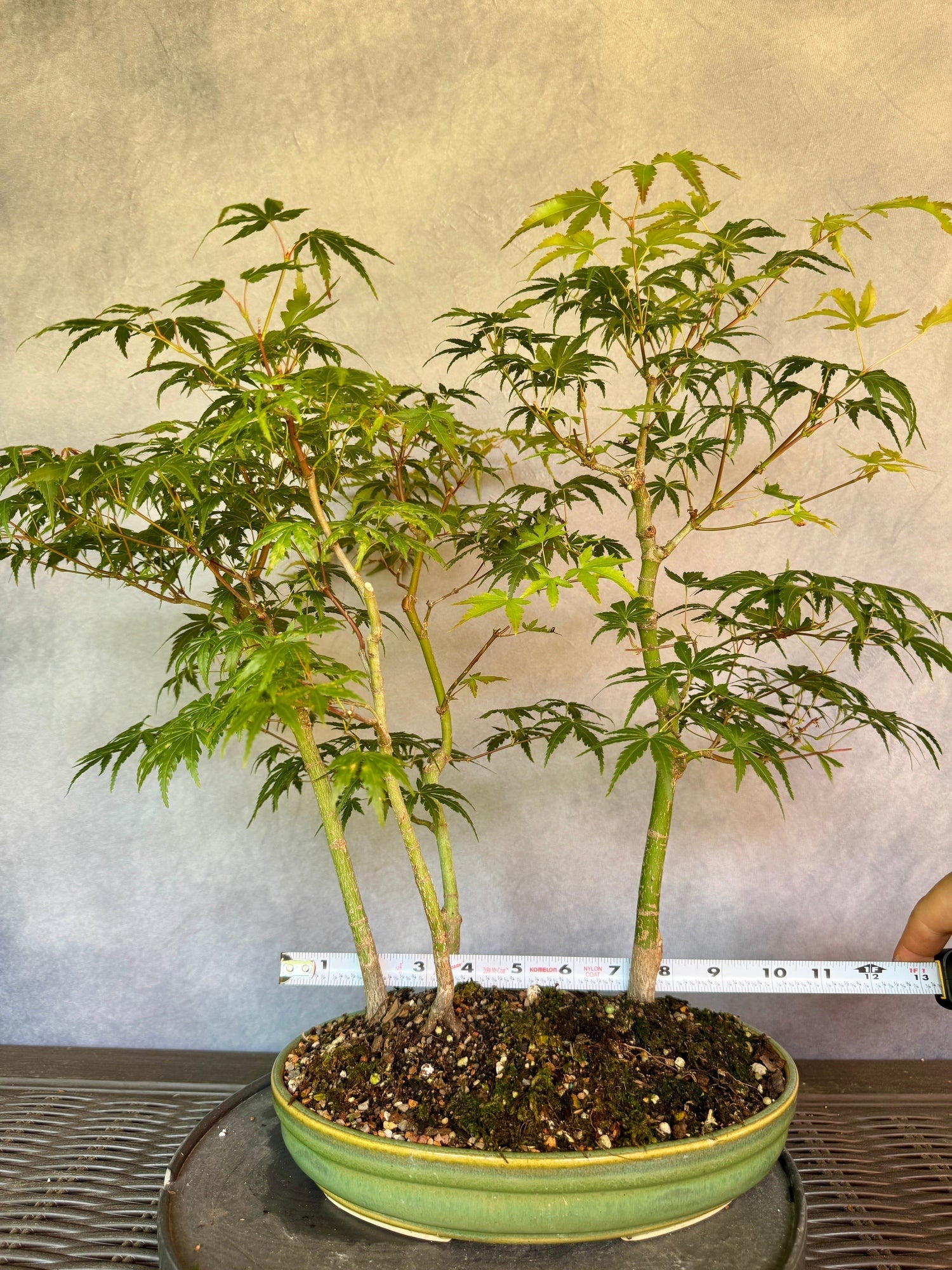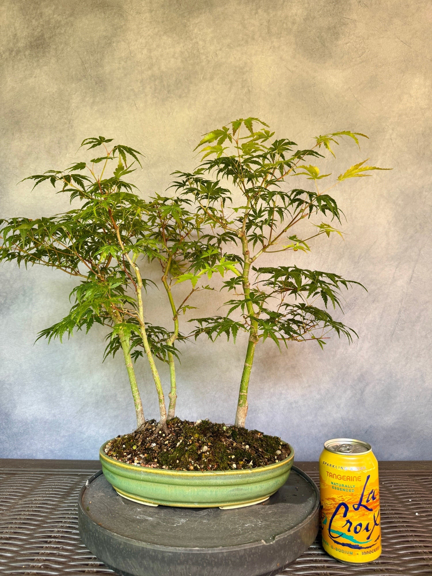 A nice forest arrangement of green-leaf Japanese Maples in a handmade 10" Lary Howard oval pot with iridescent green-blue finish. A composition already well on its way to refinement, the trees have been in container culture since germinating as seedlings, when they were selected for displaying semi-dwarf characteristics and fine growth habit.Â