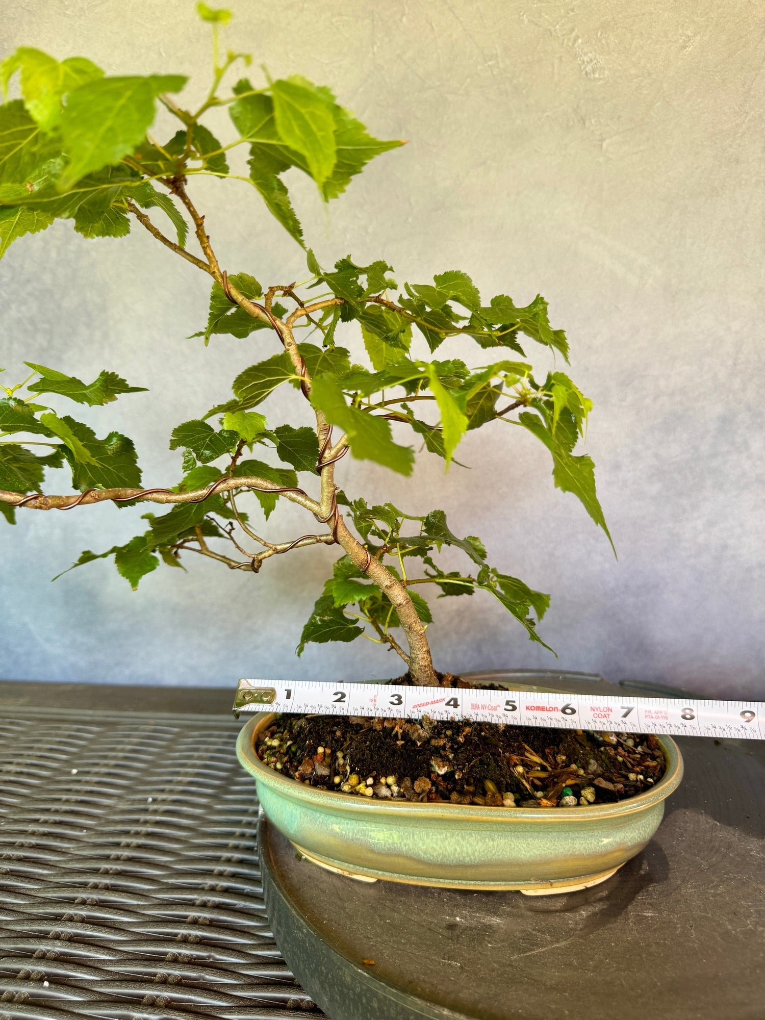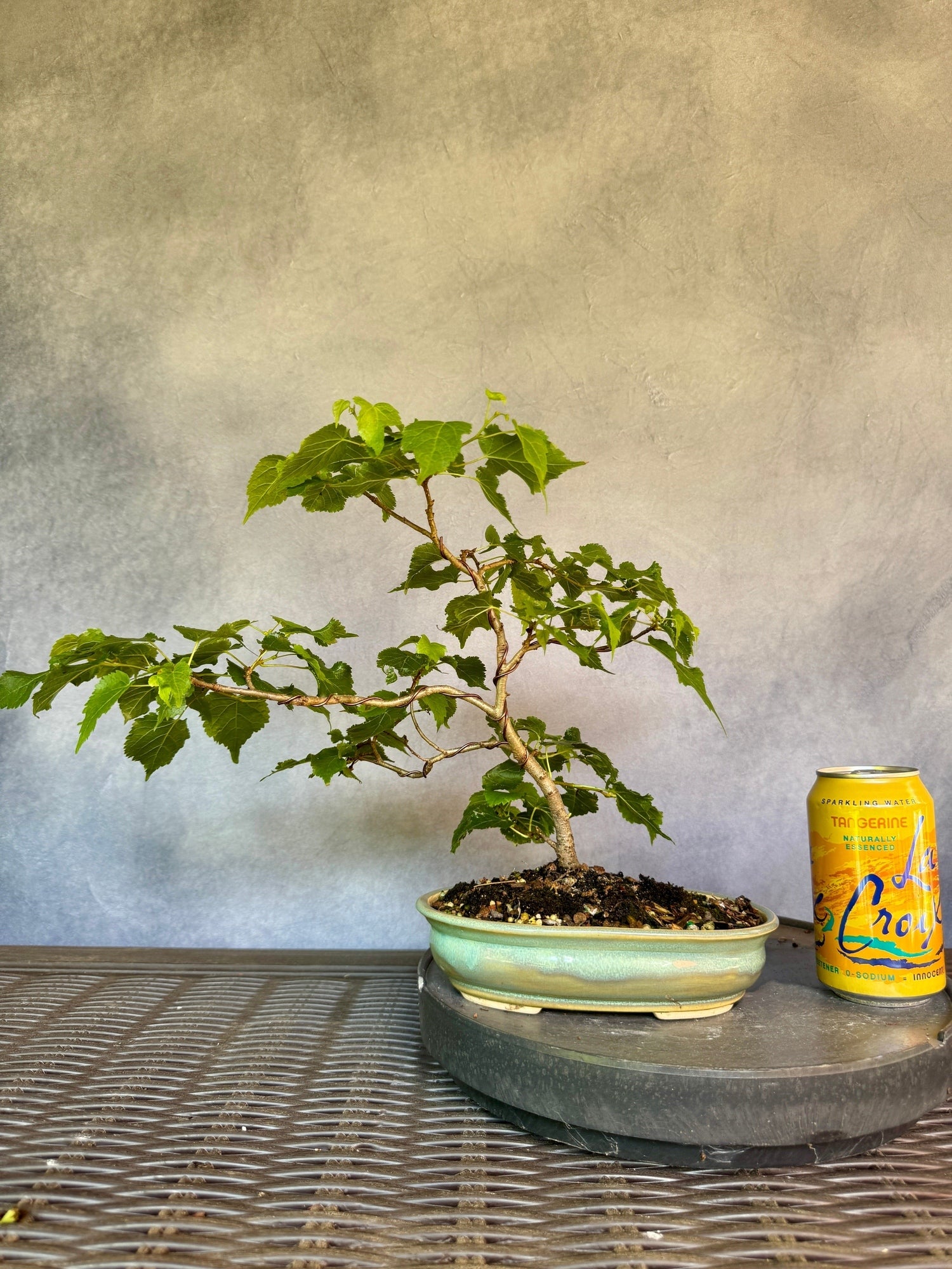 This rare, ultra-dwarf cultivar of Tilia cordata displays a flowing, wispy form with leaves around 1/10th the size of the species. The 'Lico' variety grows extremely slowly (perhaps 1-3" in container culture) and is exceptionally cold hardy. A reaching, delicate arrangement, this tree has been growing for about 2 years in this beautiful iridescent pot handmade Lary Howard.