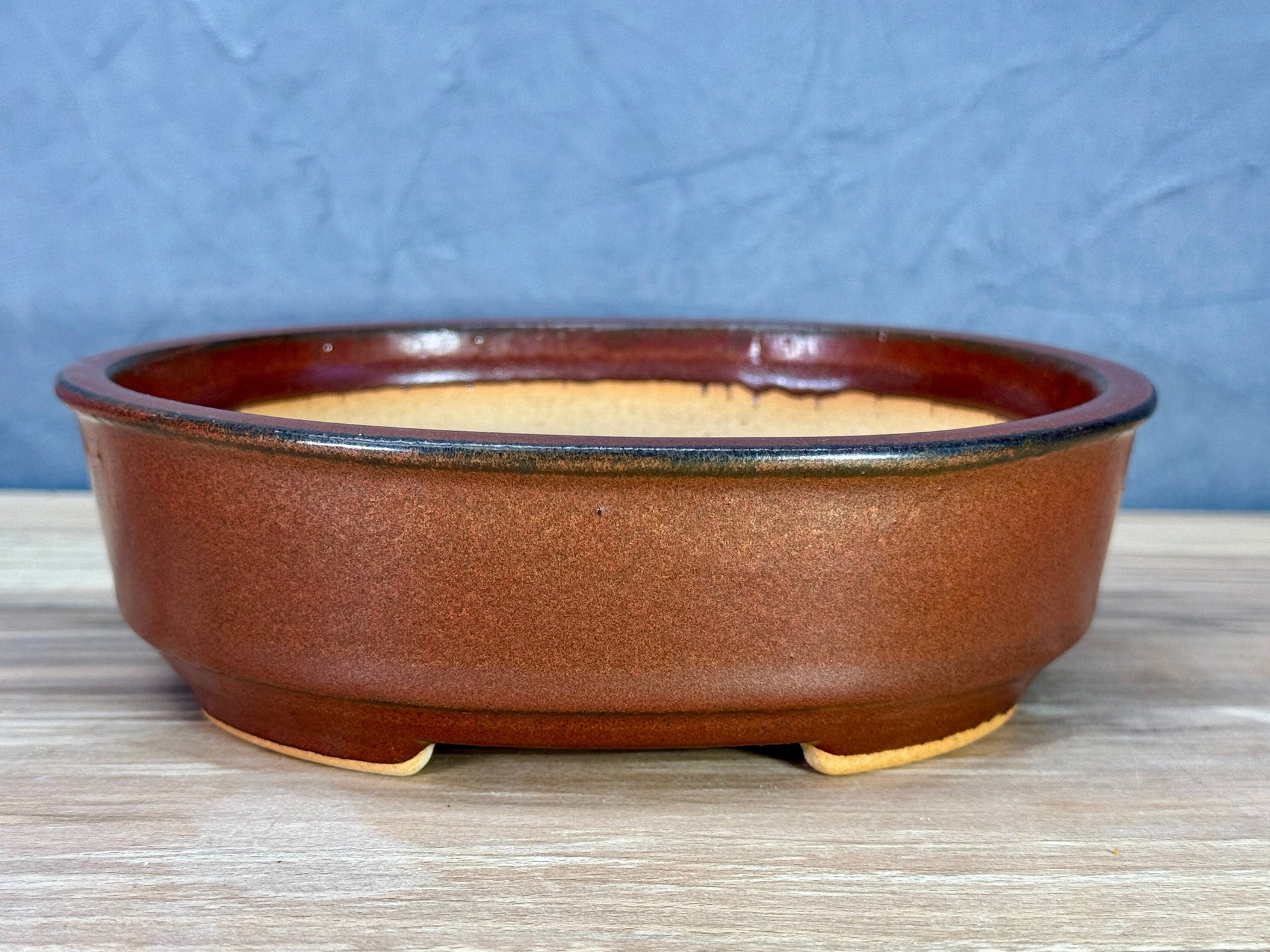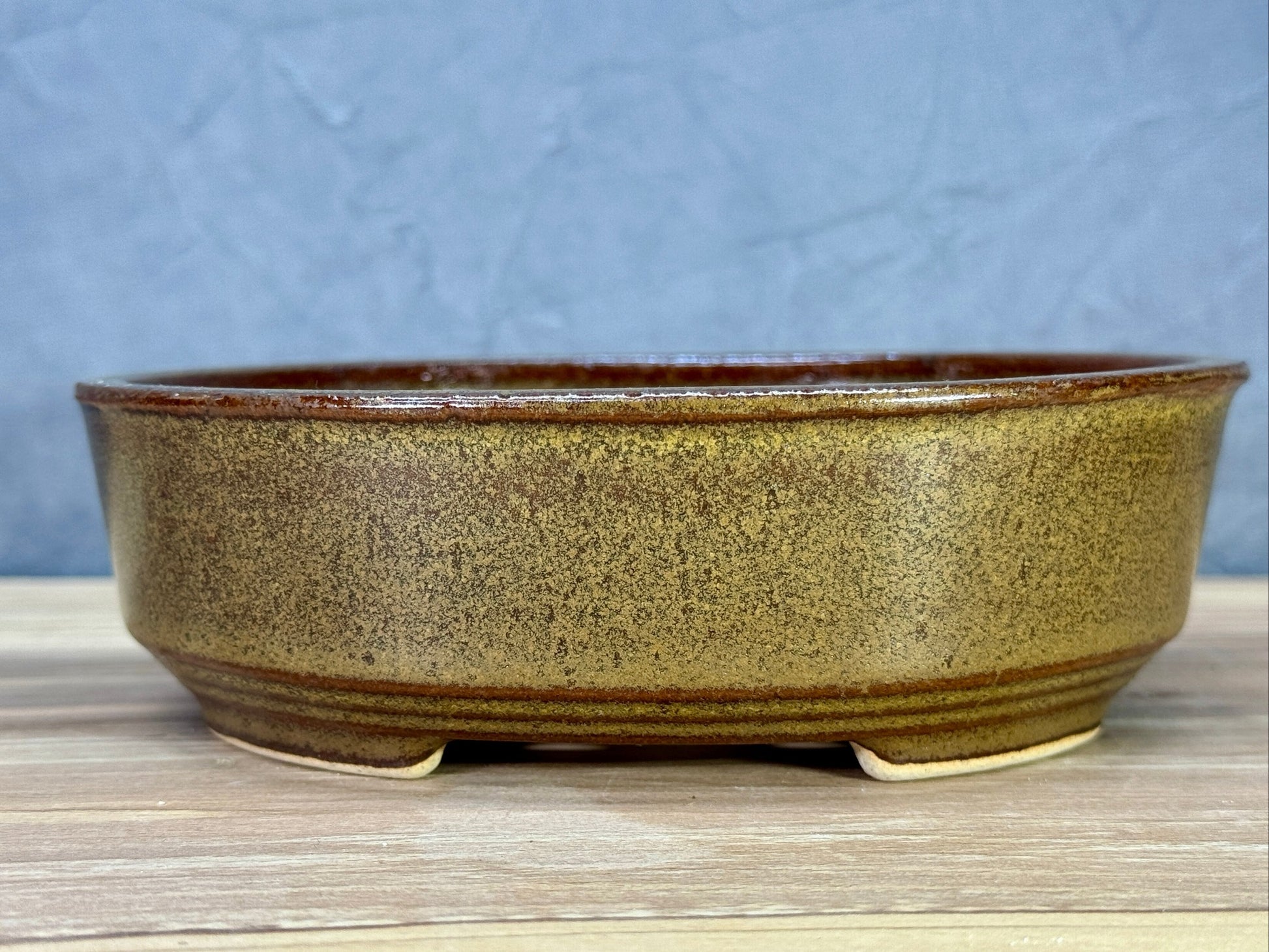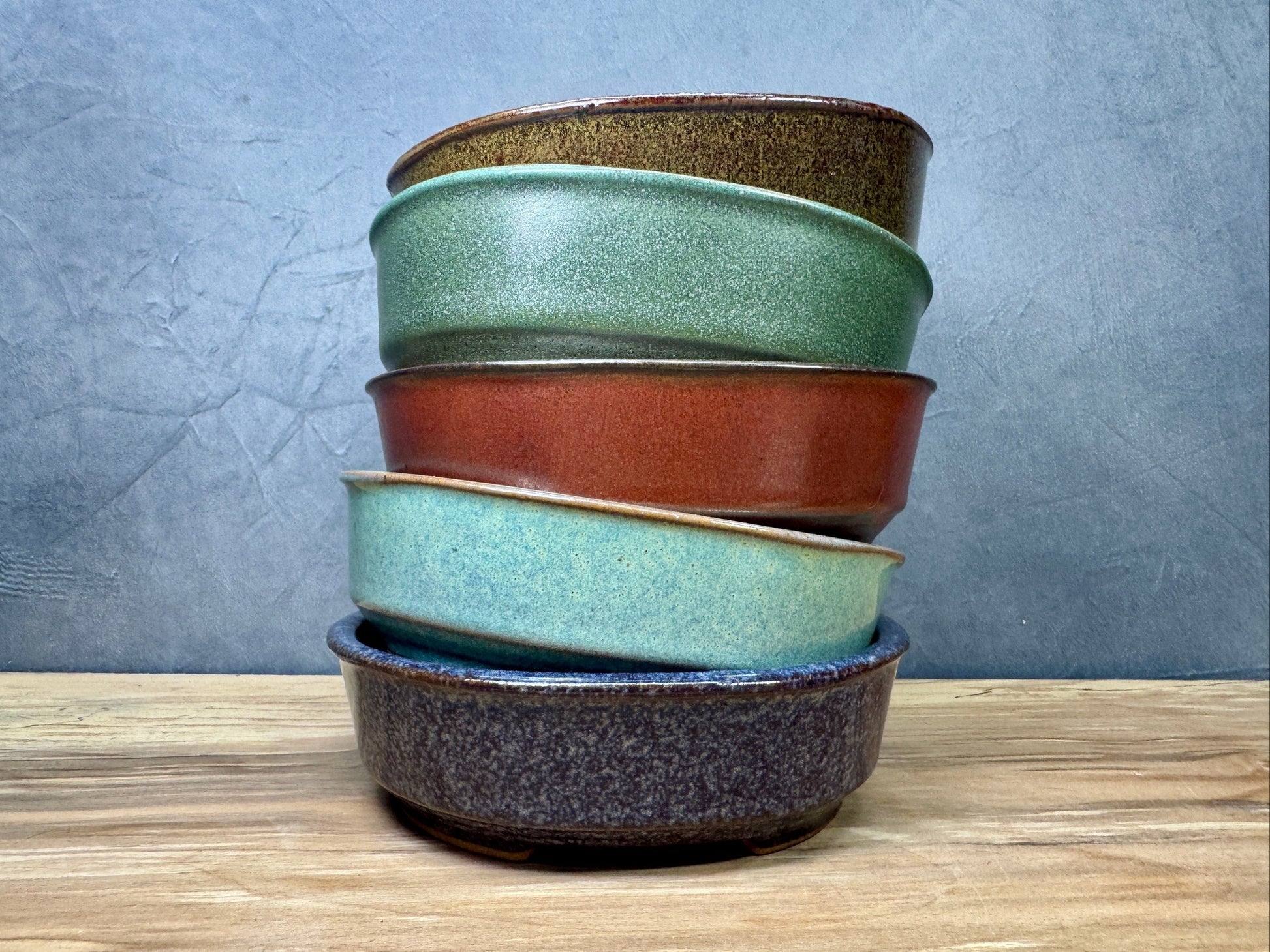 These higher quality Korean ovals feature a variety of glaze options and are perfect for shohin and kifu size trees. Beautiful detail in the finishes, all of which show complex textures on a classic form. Chop mark/stamp on bottom.