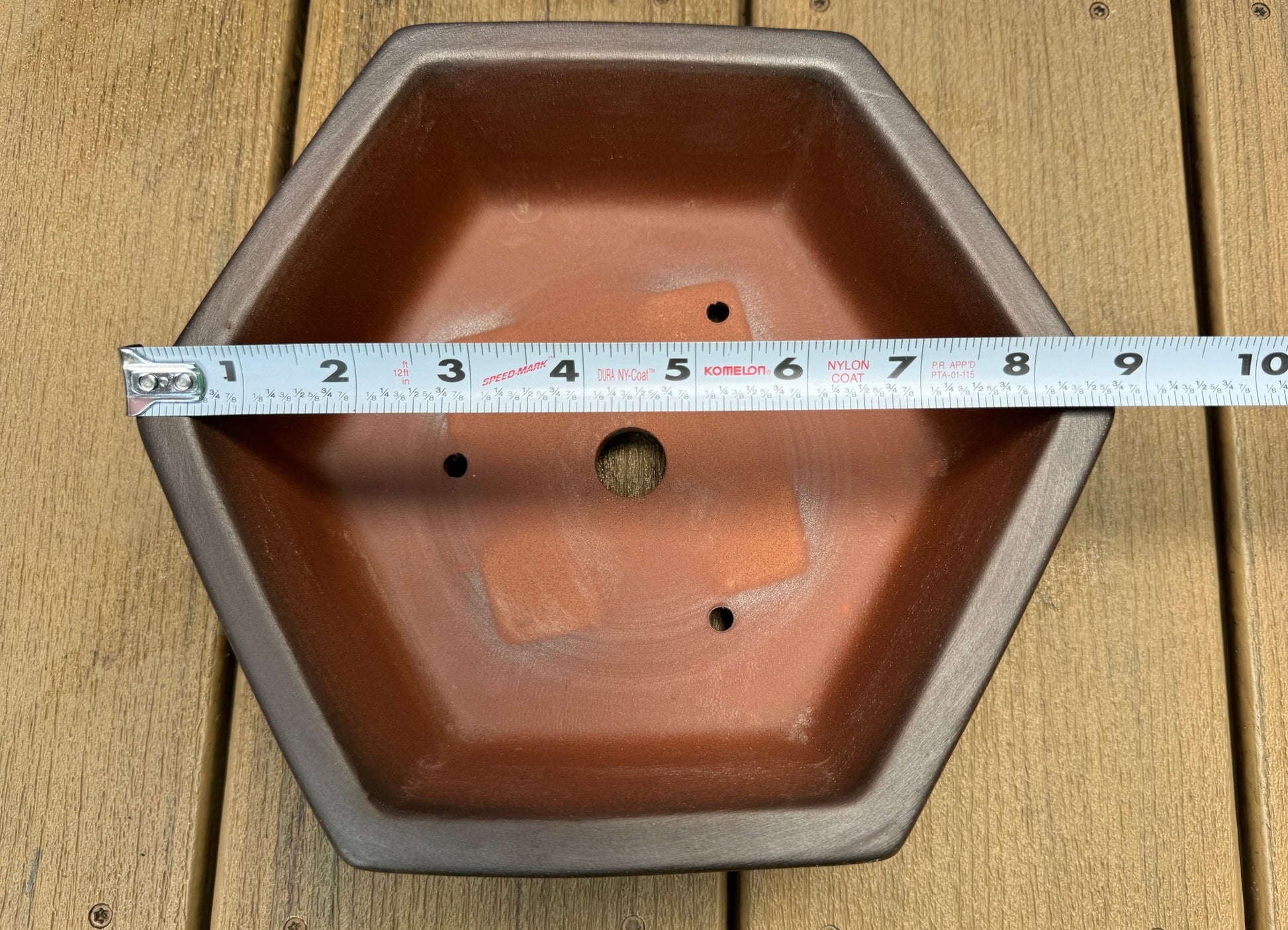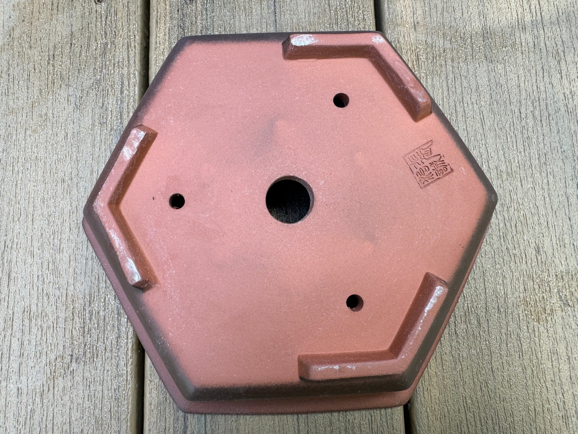 Sporting a unique shallow hexagon form, this unglazed Yixing pot has a horizontal gradient tone and is great for modern or unconventional compositions. Chop mark/stamp on bottom. A more entry-level pot made with natural red clay.