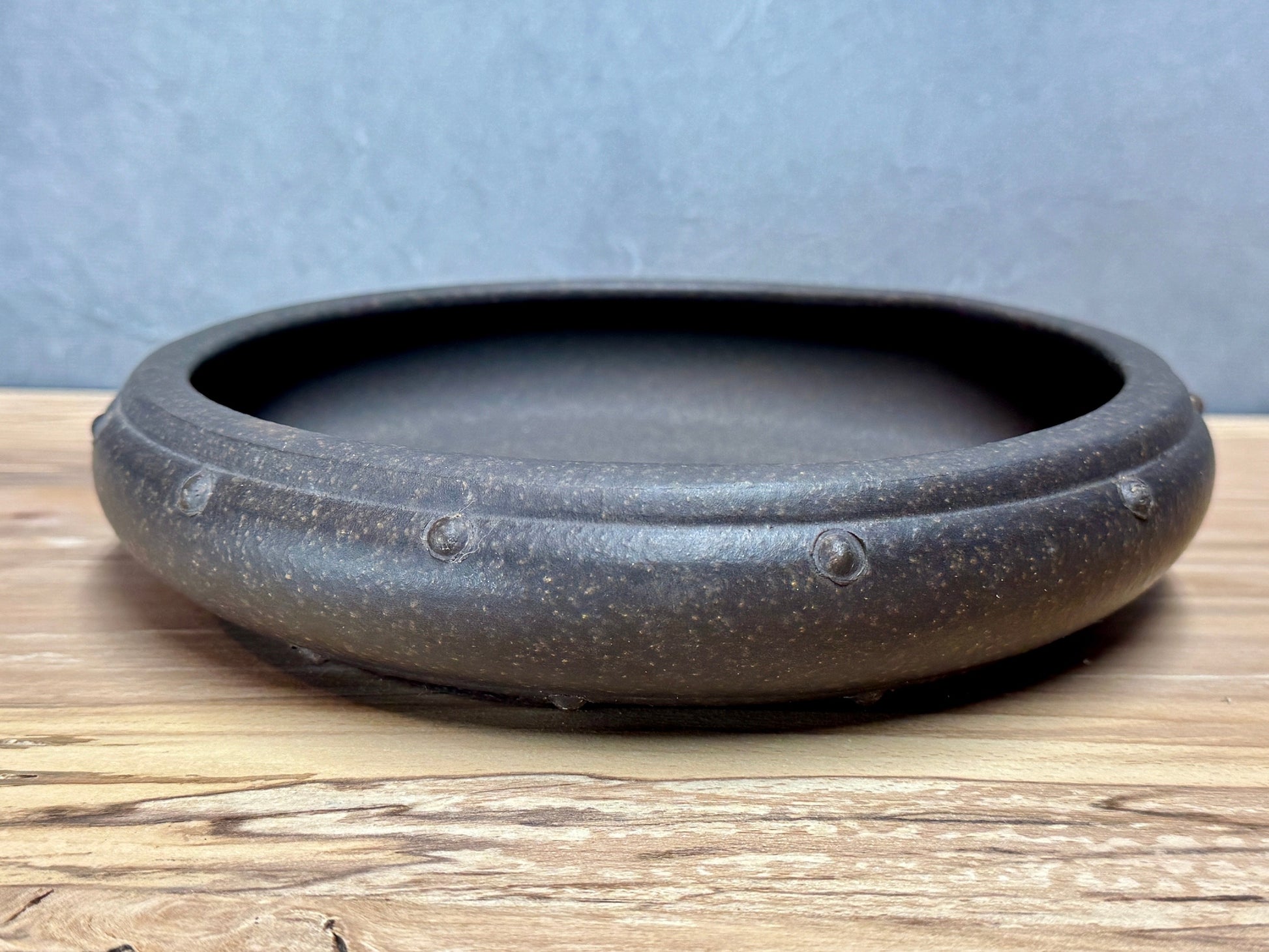 This elegant Yixing pot features a classic Chinese round design with rivets on the top and bottom rim and an aged bronze finish. Chop mark/stamp on bottom.