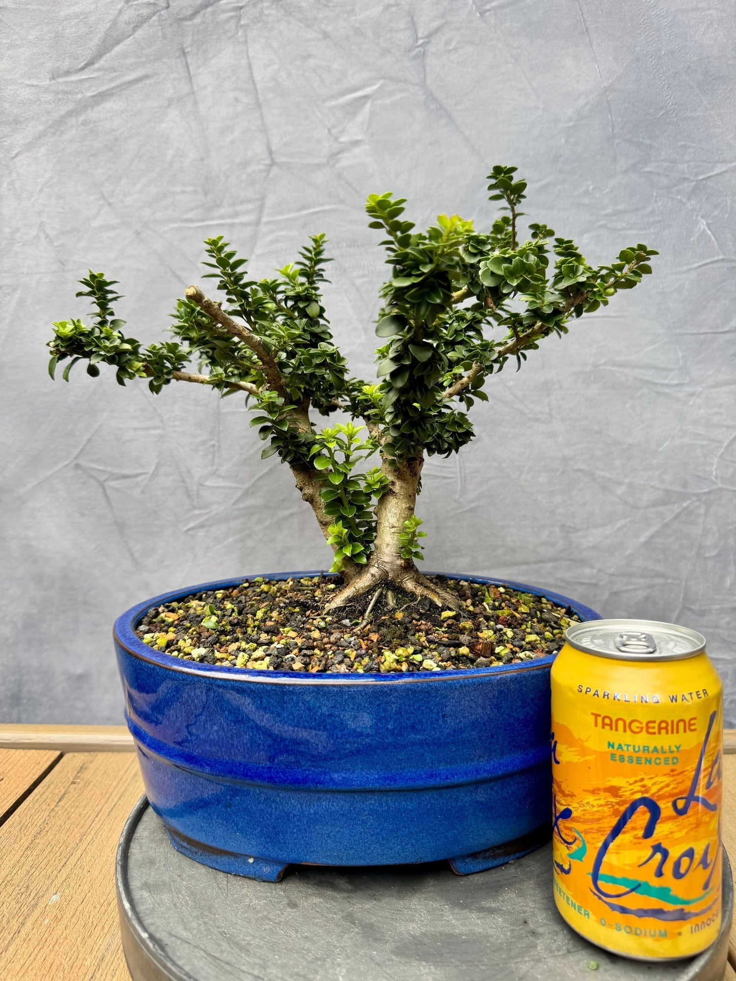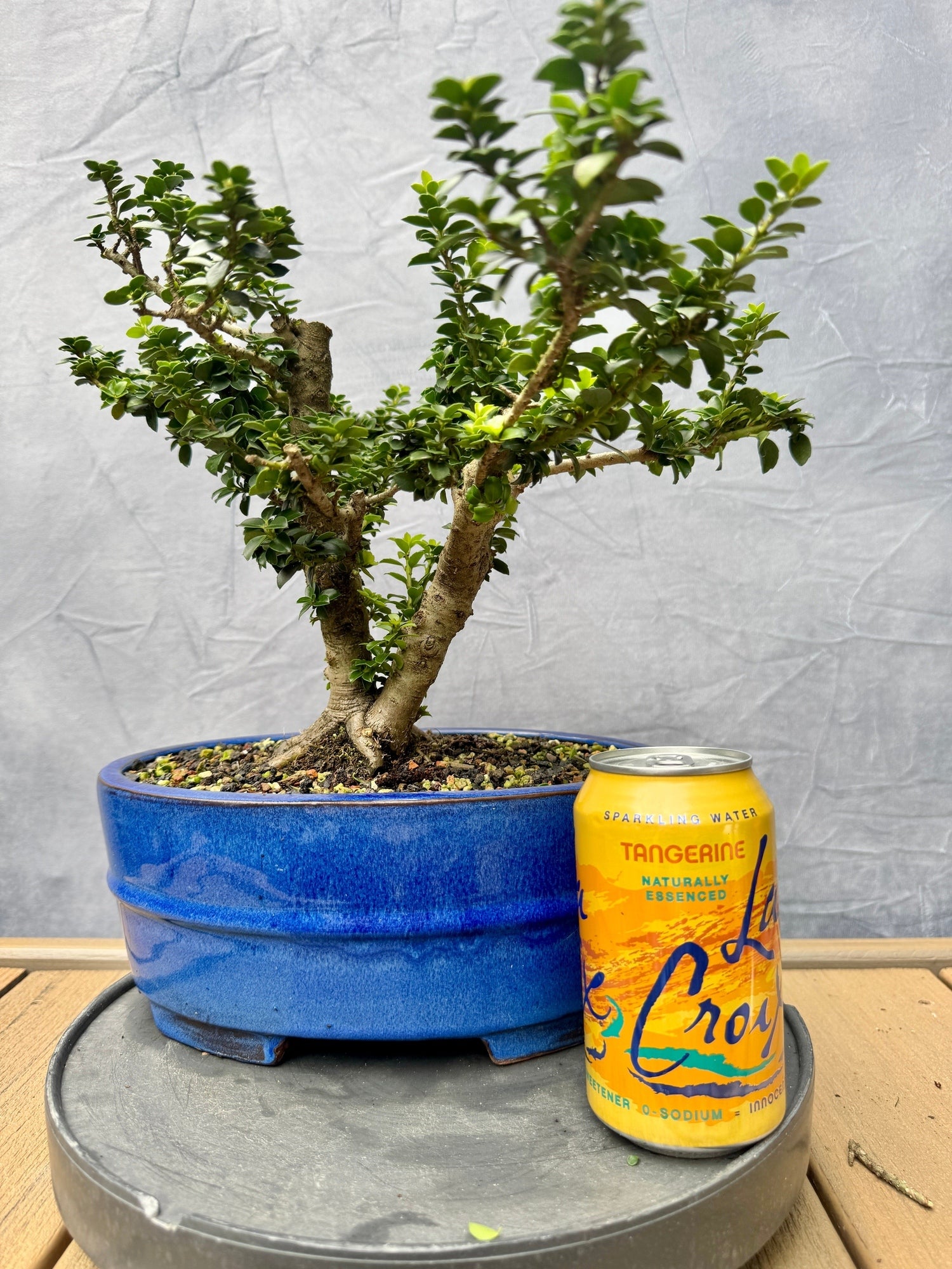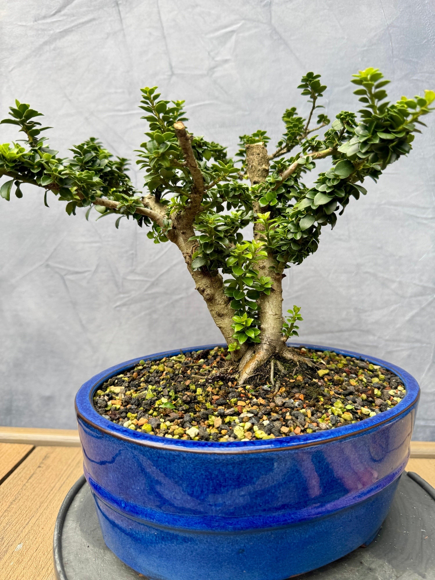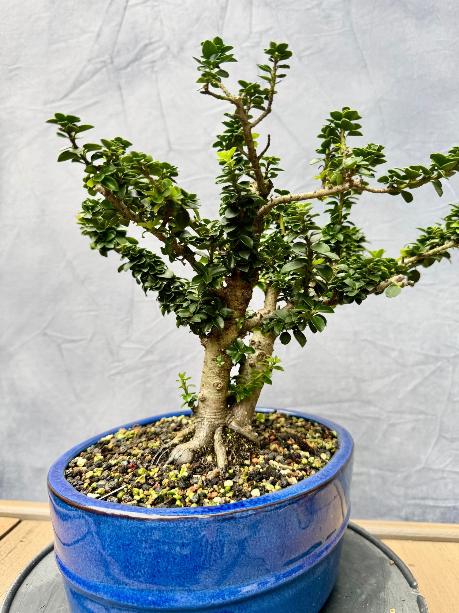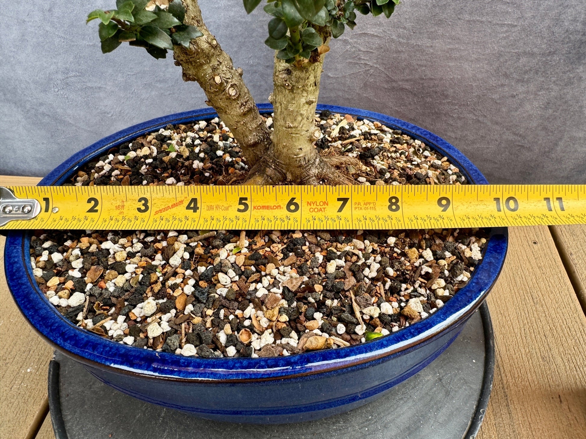 A unique twin trunk Dwarf Pagoda Holly made from quite old nursery stock. This rare cultivar is very slow-growing and sports tiny dark green leaves that appear in tight layers. Lots of design options here, with some initial shaping done over the last 12-18 months. In dark blue glazed 10” Chinese production pot.